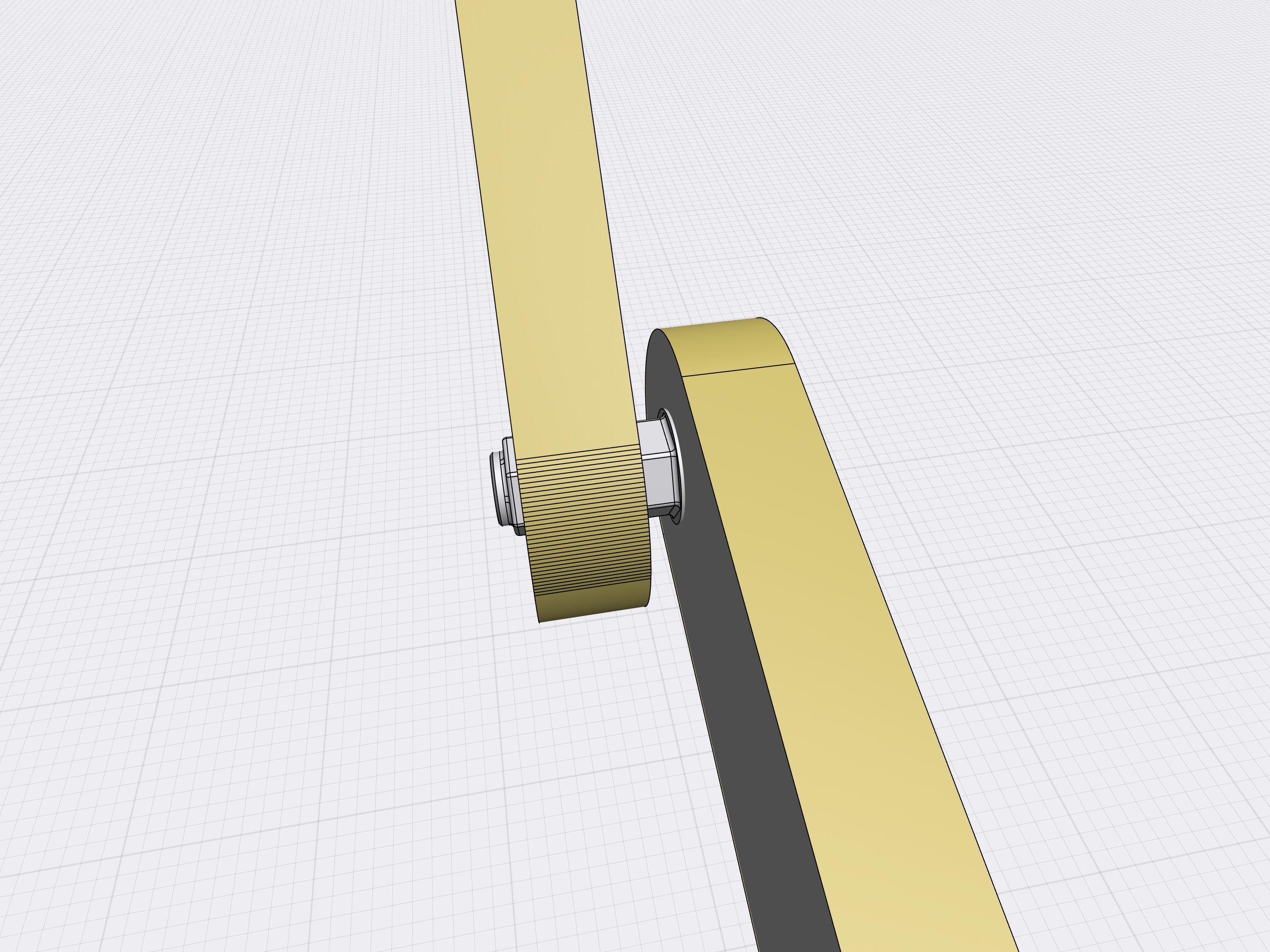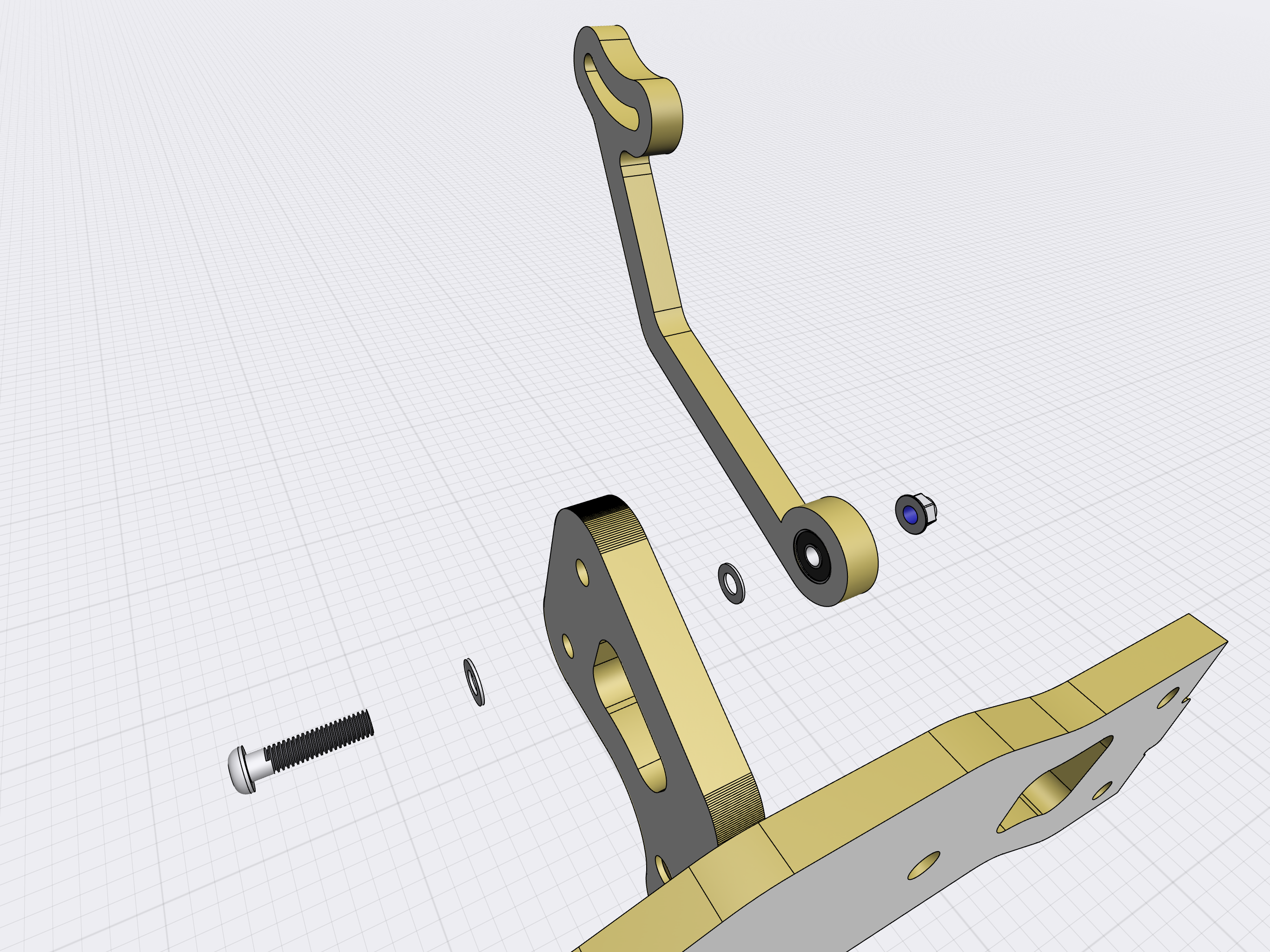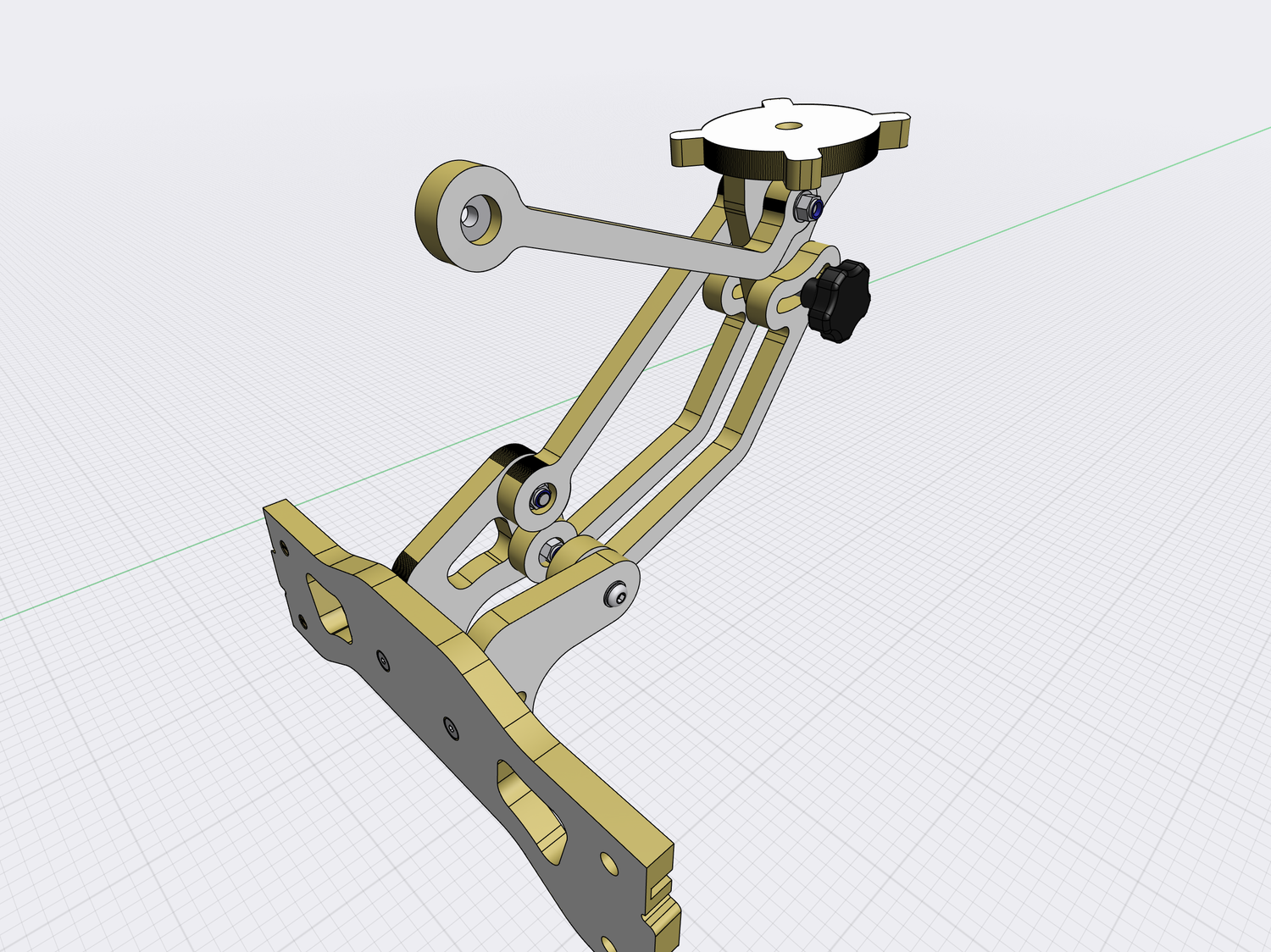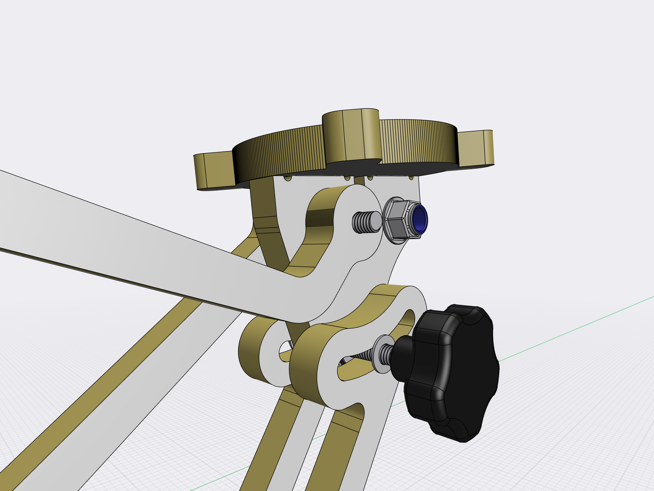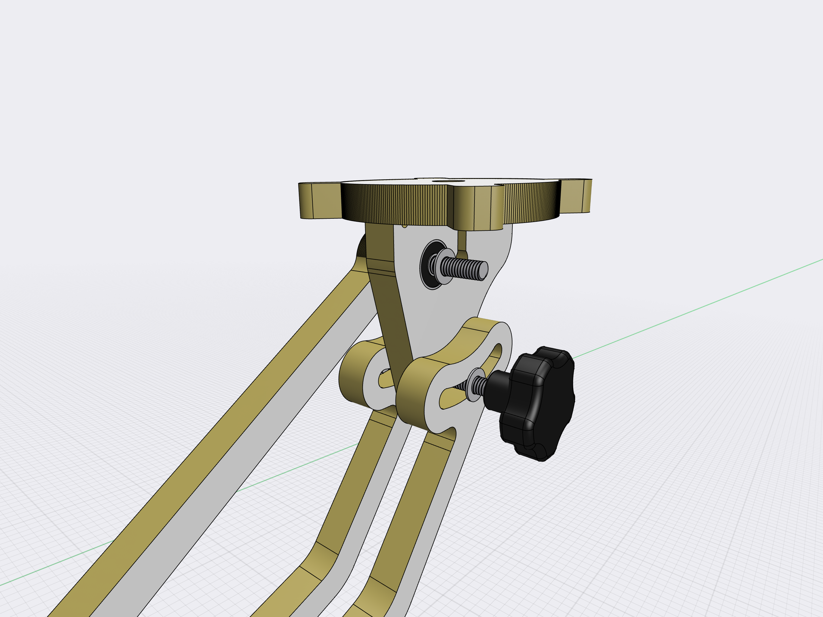 The black knob adjusts the toy base angle. Use 4 washers between every moving part. On the upper bolt there will be the L-shape rod attached.