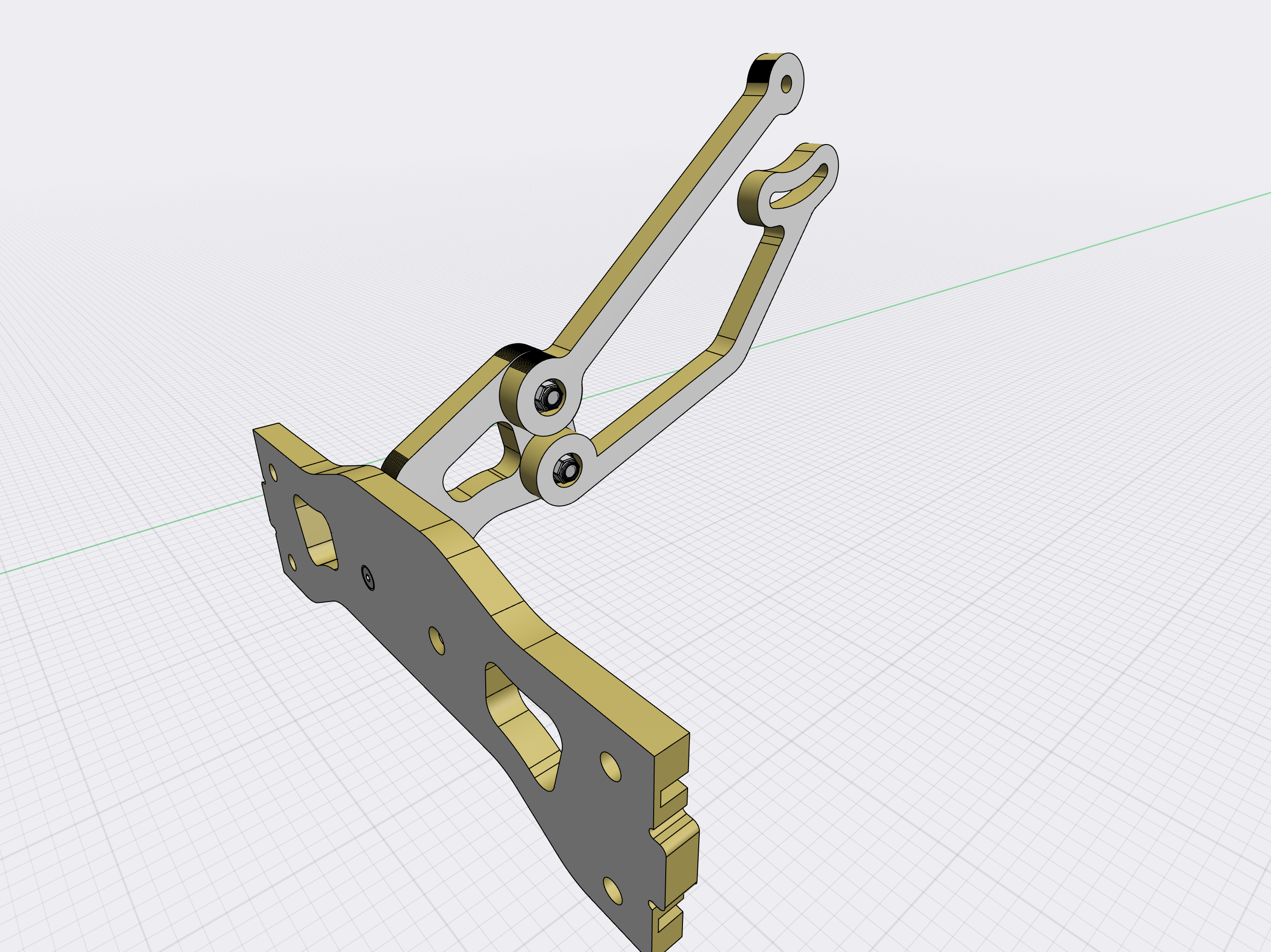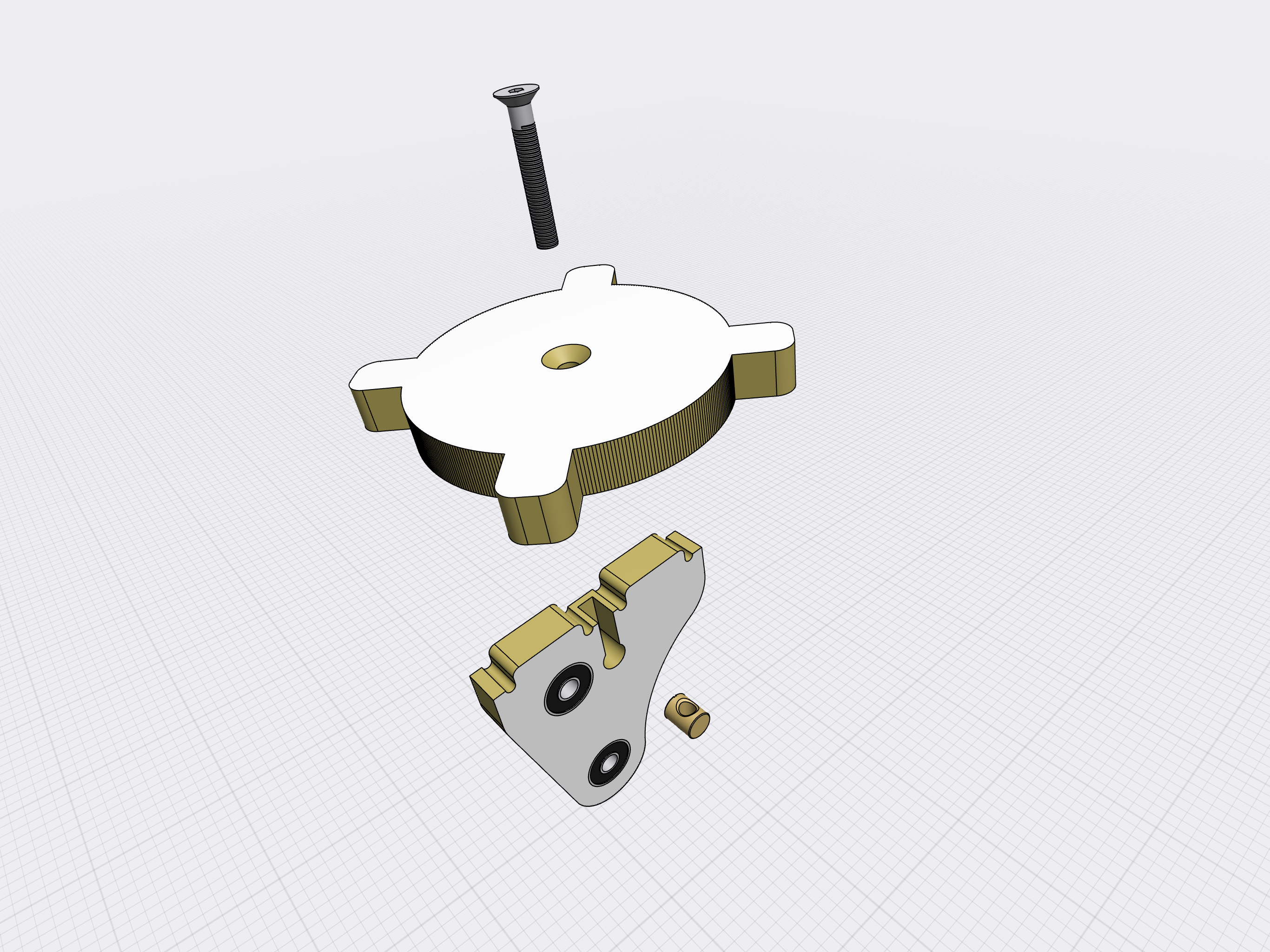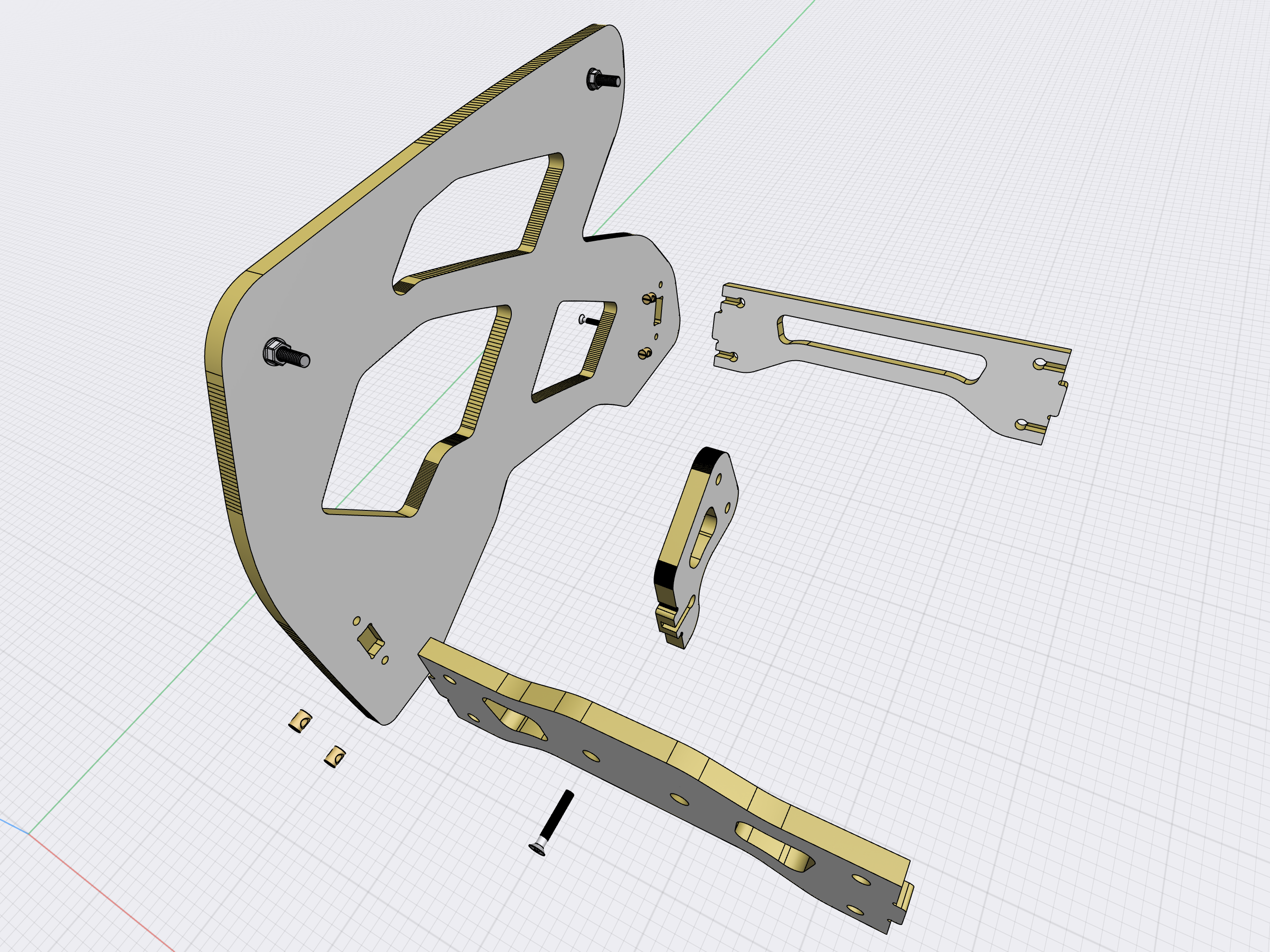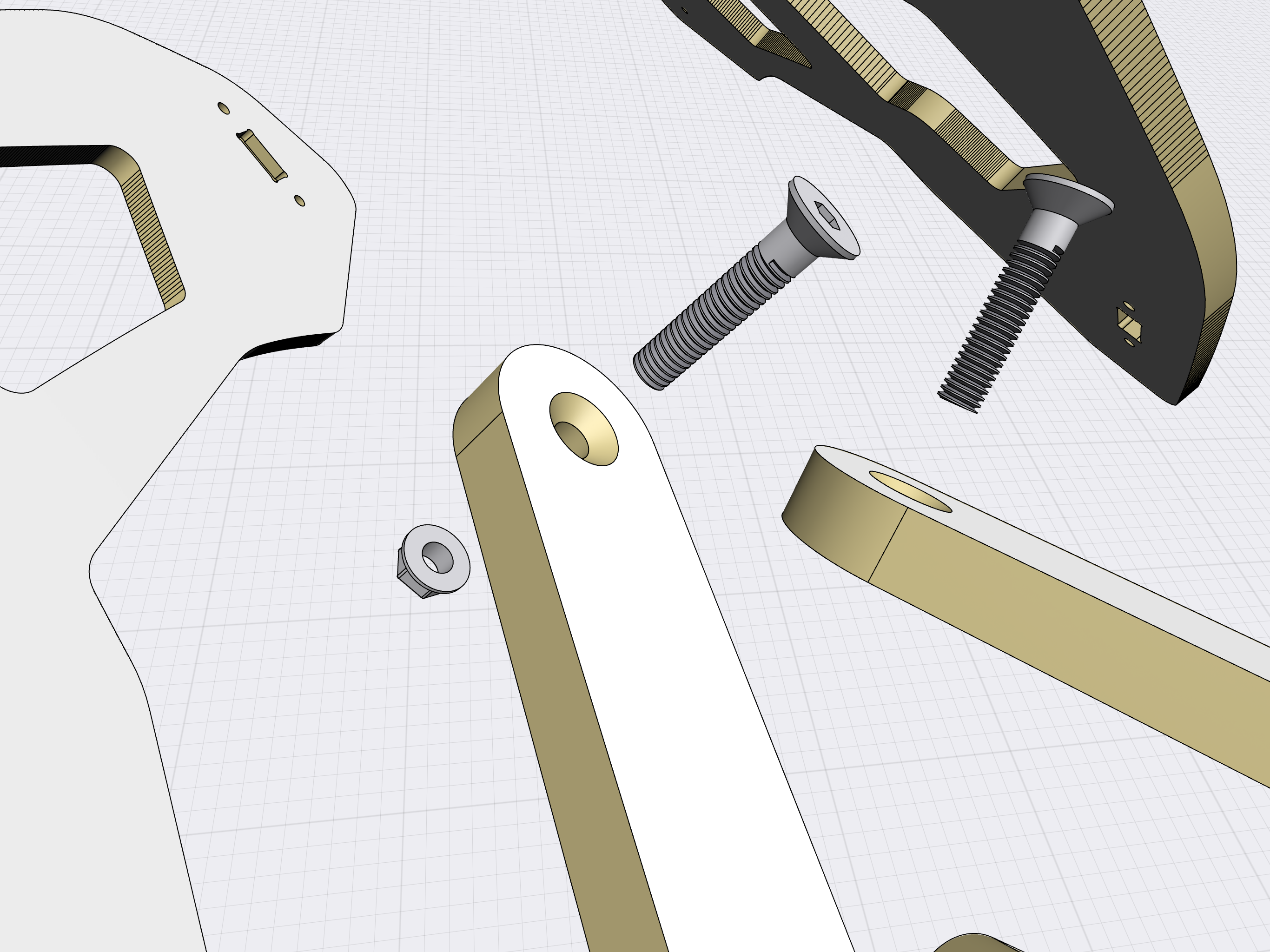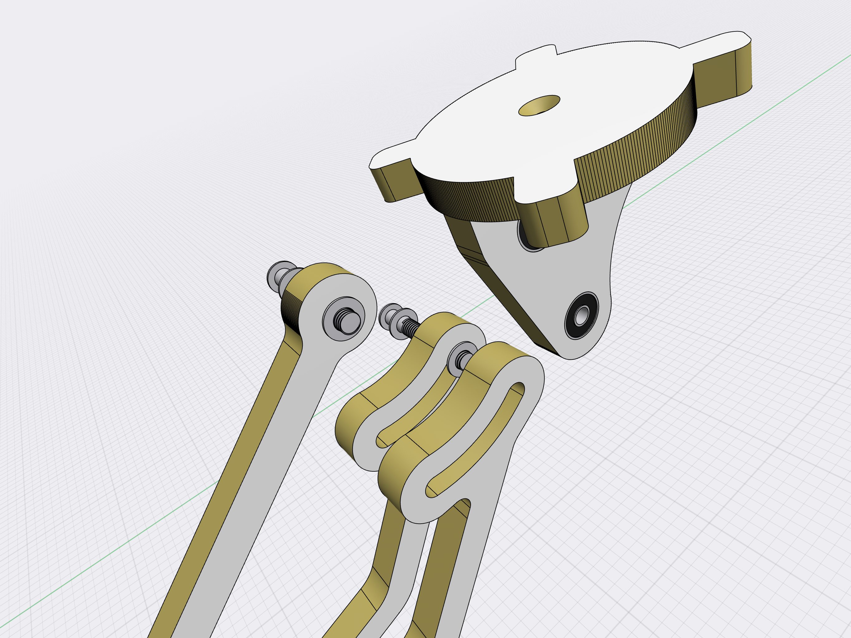 The black knob adjusts the toy base angle. Use 4 washers between every moving part. On the upper bolt there will be the L-shape rod attached.